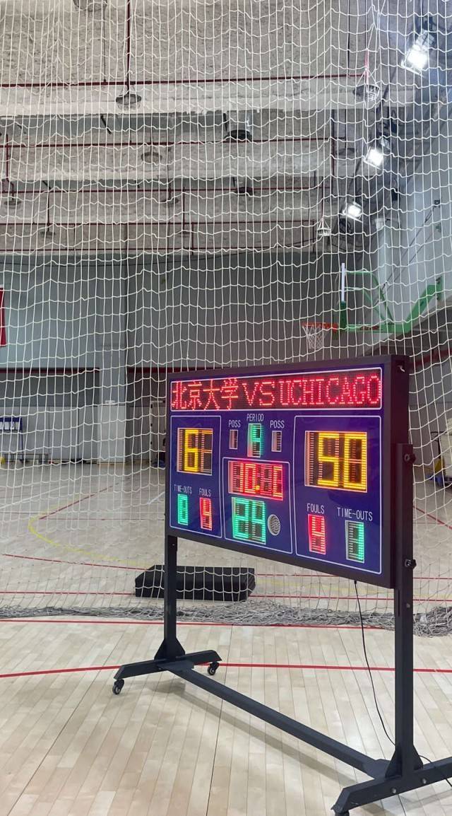 这是一场5v5篮球友谊赛,芝加哥大学女子篮球队的篮板在赛场右侧、靠近记分板的位置,北大则在左侧。
