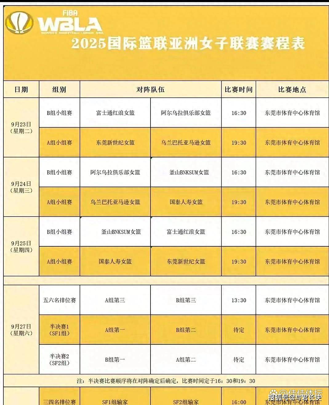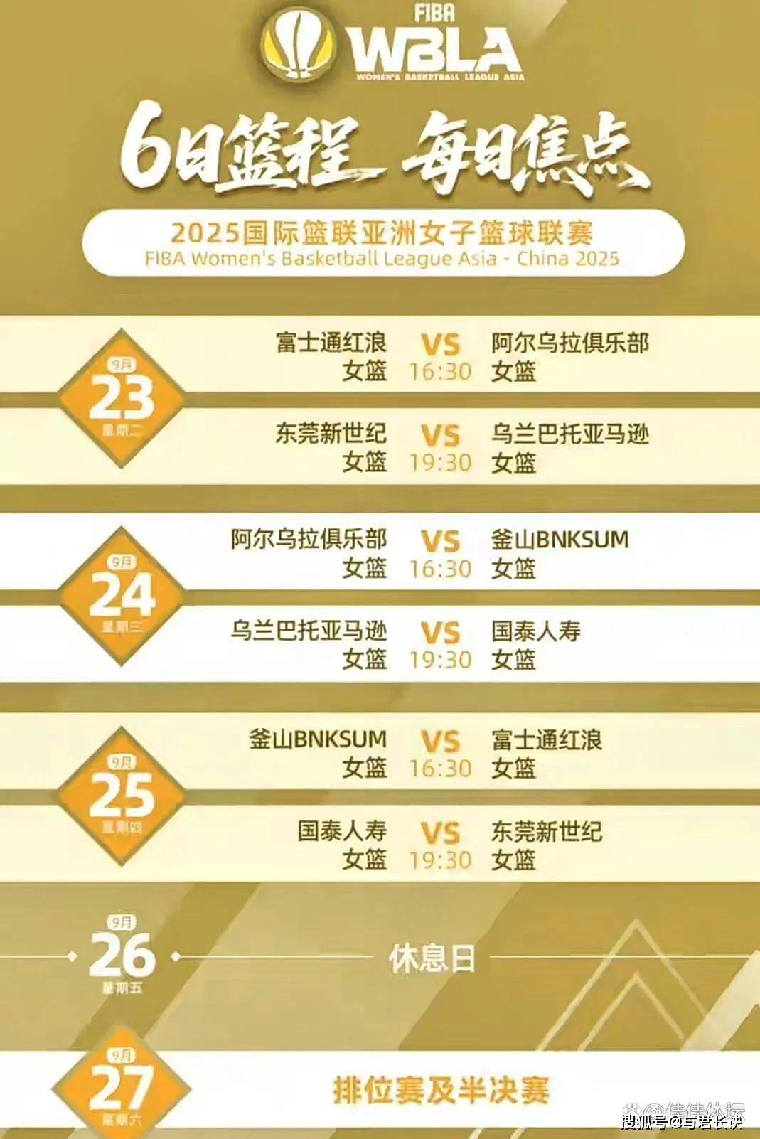 赛程安排极为紧凑,对球员体能是巨大考验。 9月23日晚19:30,东莞女篮迎战小组赛首个对手乌兰巴托亚马逊女篮;9月25日晚19:30,对阵中国台北国泰人寿女篮。 9月27日进行半决赛,9月28日则进行决赛,这意味着从首战到决赛,5天内需进行4场比赛。