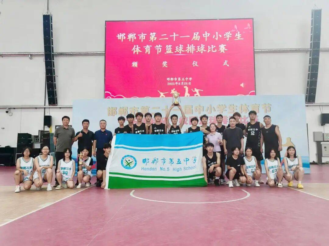 ▲8月26日,邯郸市第二十一届中小学生体育节校园篮球比赛圆满收官。邯郸市第五中学男篮以六战全胜的绝对优势勇夺桂冠。
