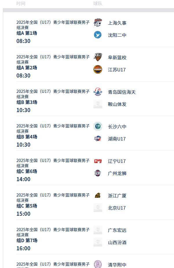 今天共有8场比赛进行,除了上述5场外,浙江广厦对北京U17,清华附中对海亮外语中学,长沙六中对湖南U17等比赛也值得篮球爱好者关注。