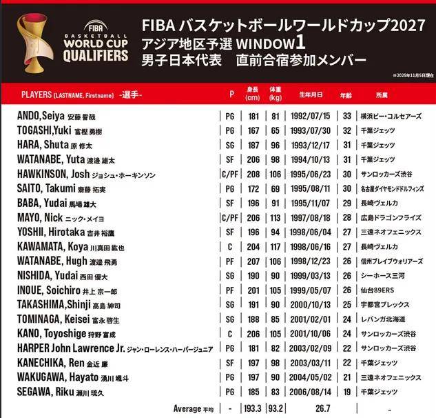 2025-11-05CBA,中国男子篮球职业联赛,CBA赛程,CBA直播,CBA比分,CBA投注/提供CBA最新赛程、实时比分、球队阵容、球员数据及盘口分析,服务中文球迷与篮球数据爱好者,让你全面掌握CBA最新动态。北京时间11月5日,日本篮协正式公布了男篮世界杯预选赛第一窗口期的集训名单,一共20名球员入选,全队将在11月17日集中训练。值得注意的是,刚刚被NBA芝加哥公牛队裁掉的后卫河村勇辉并未出现在名单中,而此前缺席亚洲杯的渡边雄太此次回归。