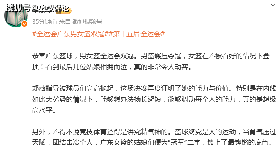 篮球记者季孟年发文点评:恭喜广东篮球,男女篮全运会双冠。男篮碾压夺冠,女篮在不被看好的情况下登顶!看到最后几位姑娘相拥而泣,真的非常令人动容。