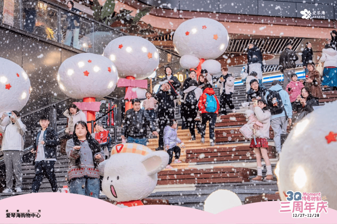 12月26日至31日,“苹果派对”市集热闹开市;12月28日庆生派对:巨型蛋糕派发、梦幻飘雪与音乐会等同步上演,以多元场景重构商业空间社交属性。