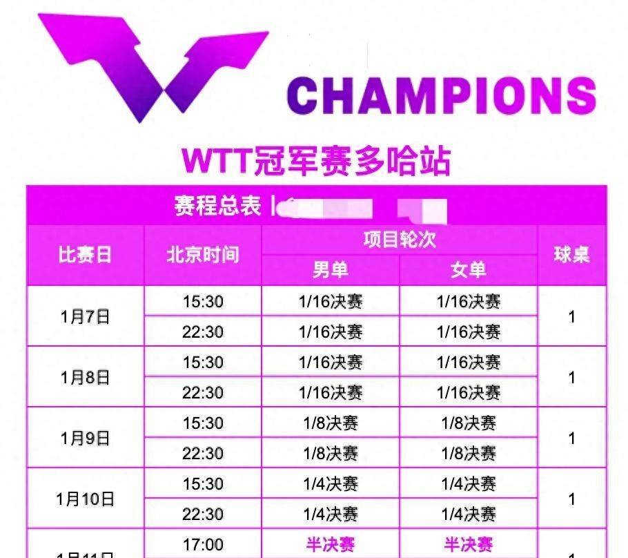 WTT多哈冠军赛定于1月7日至11日在卡塔尔多哈卢赛尔体育馆举行,全程仅设男女单打两个项目,各有32名选手参赛,冠军可斩获1000个世界排名积分,对全年积分布局有着直接影响。