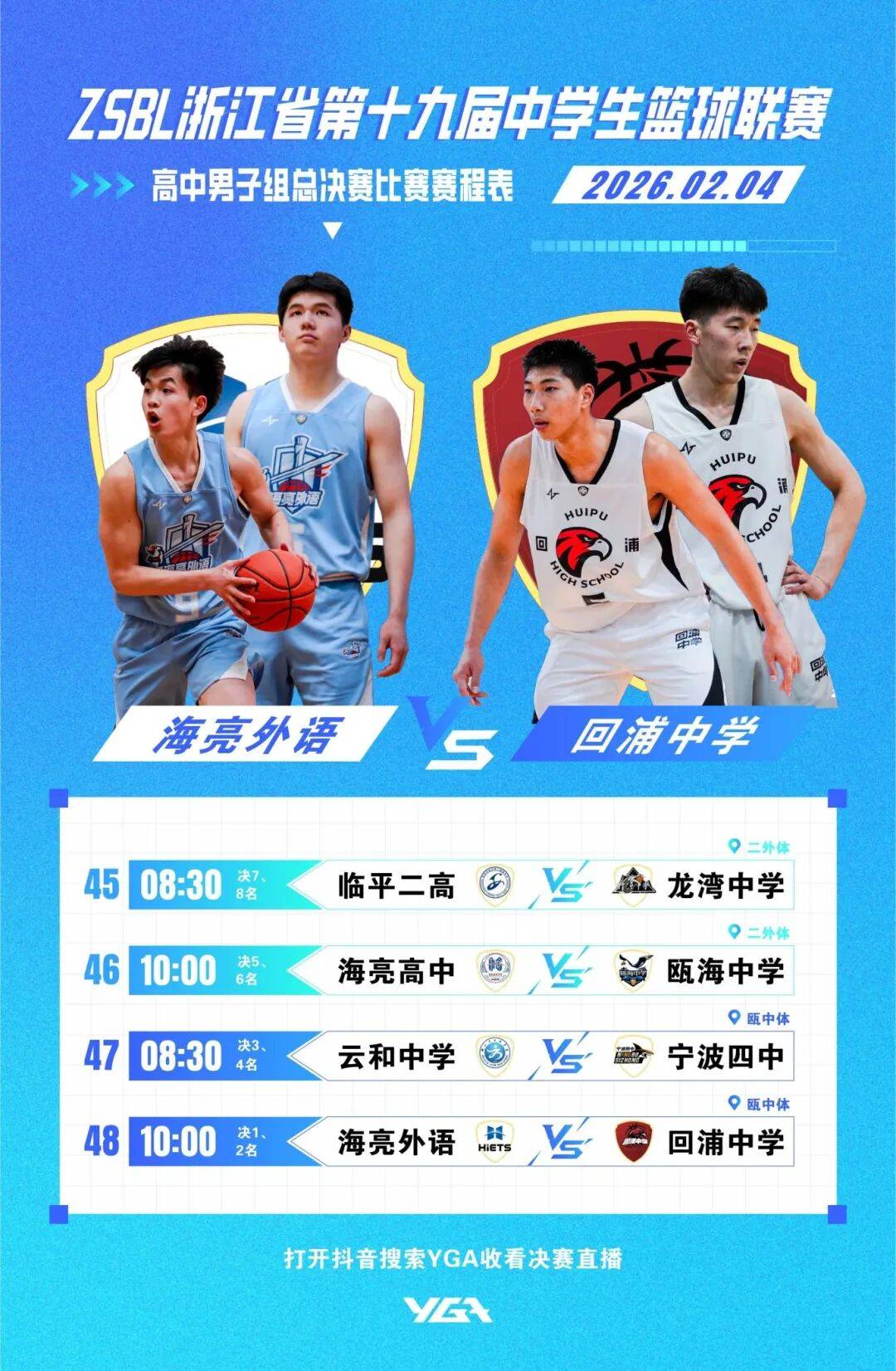 2026-02-09CBA,中国男子篮球职业联赛,CBA赛程,CBA直播,CBA比分,CBA投注/提供CBA最新赛程、实时比分、球队阵容、球员数据及盘口分析,服务中文球迷与篮球数据爱好者,让你全面掌握CBA最新动态。2月4日,ZSBL浙江省第十九届中学生篮球联赛(高中组)总决赛打响,海亮外语中学篮球队以79:74的胶着比分战胜回浦中学,加冕2026年浙江省ZSBL总冠军!