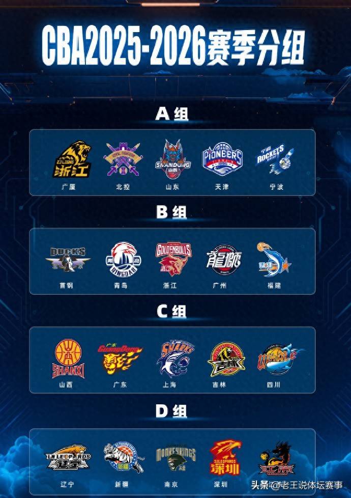 具体分组情况如下:A组汇集了浙江广厦、北京控股、山东高速、天津先行者和宁波町渥;B组包括北京首钢、青岛国信、浙江稠州、广州龙狮和福建浔兴;C组则云集了山西汾酒、广东宏远、上海久事、九台农商银行和四川金强;D组由辽宁本钢、新疆广汇、南京同曦、深圳马可波罗和苏州肯帝亚组成。从分组形势来看,C组堪称本赛季的\死亡之组\,山西、广东和上海三支劲旅齐聚,他们在休赛期都进行了重磅引援。