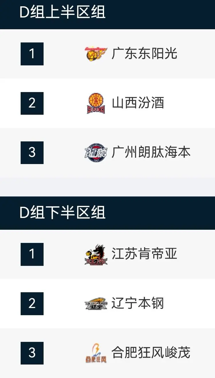 第二届CBA俱乐部杯小组赛2025年12月3日-8日在湖南长沙、江西南昌、广西南宁和湖北武汉四个赛区进行。D组比赛已于3日在湖北武汉正式打响,六支球队分上、下两个半区,其中广东、山西、龙狮在上半区,辽宁、江苏、合肥在下半区。