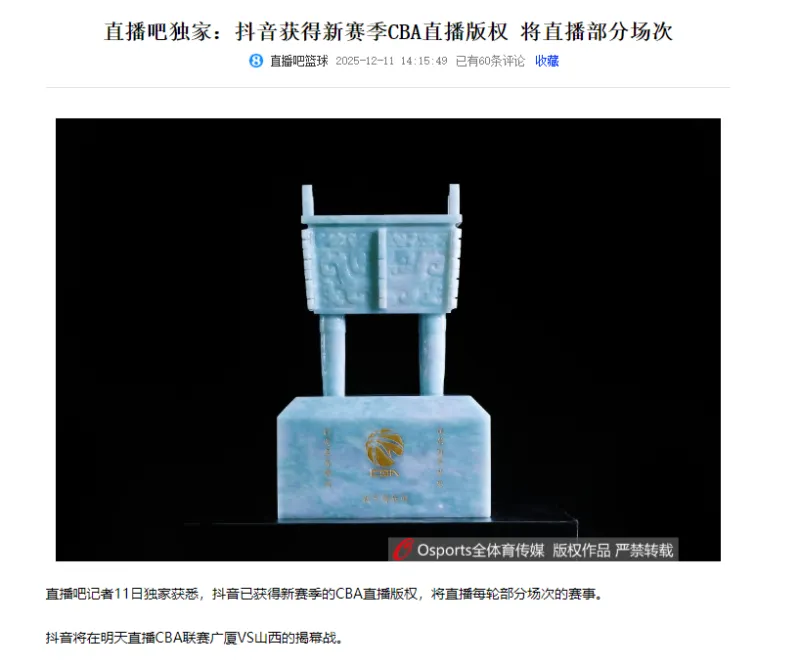 抖音正式获得 2025-2026 赛季 CBA 联赛直播版权,将直播每轮部分场次赛事,首秀锁定 12 月 12 日揭幕战广厦 VS 山西的对决。