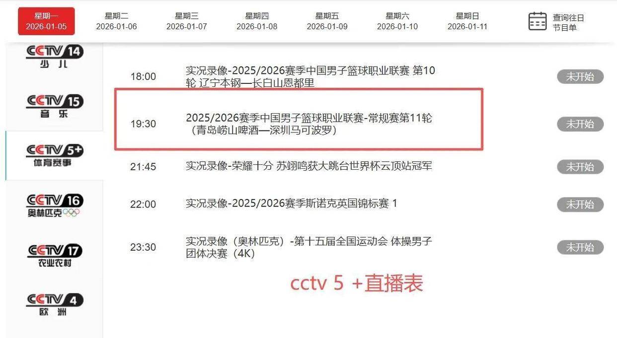 央视体育频道CCTV5今晚并未安排CBA直播,但CCTV5 频道将全程直播青岛与深圳的比赛。 想要观看广东对阵浙江或上海对阵广厦的球迷,需要通过咪咕视频、抖音等网络平台获取直播信号。