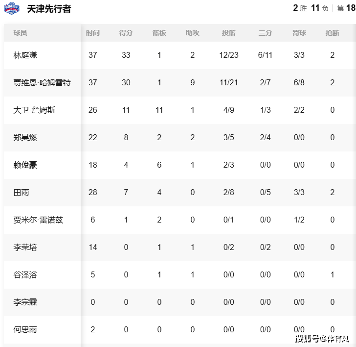 天津先行者队:林庭谦33分1篮板2助攻、贾维恩·哈姆雷特30分1篮板9助攻、大卫·詹姆斯11分11篮板1助攻、郑昊燃8分2篮板2助攻、田雨7分4篮板、赖俊豪4分6篮板1助攻、贾米尔·雷诺兹1分2篮板、谷泽浴1篮板1助攻、李荣培1篮板1助攻。