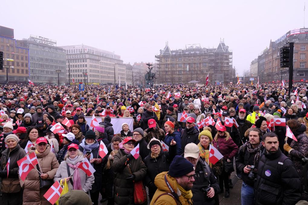 1月17日,人们在丹麦首都哥本哈根的市政厅广场参加。数千名丹麦人17日在首都哥本哈根举行,抗议美国企图控制格陵兰岛的行径。新华社记者张玉亮摄
