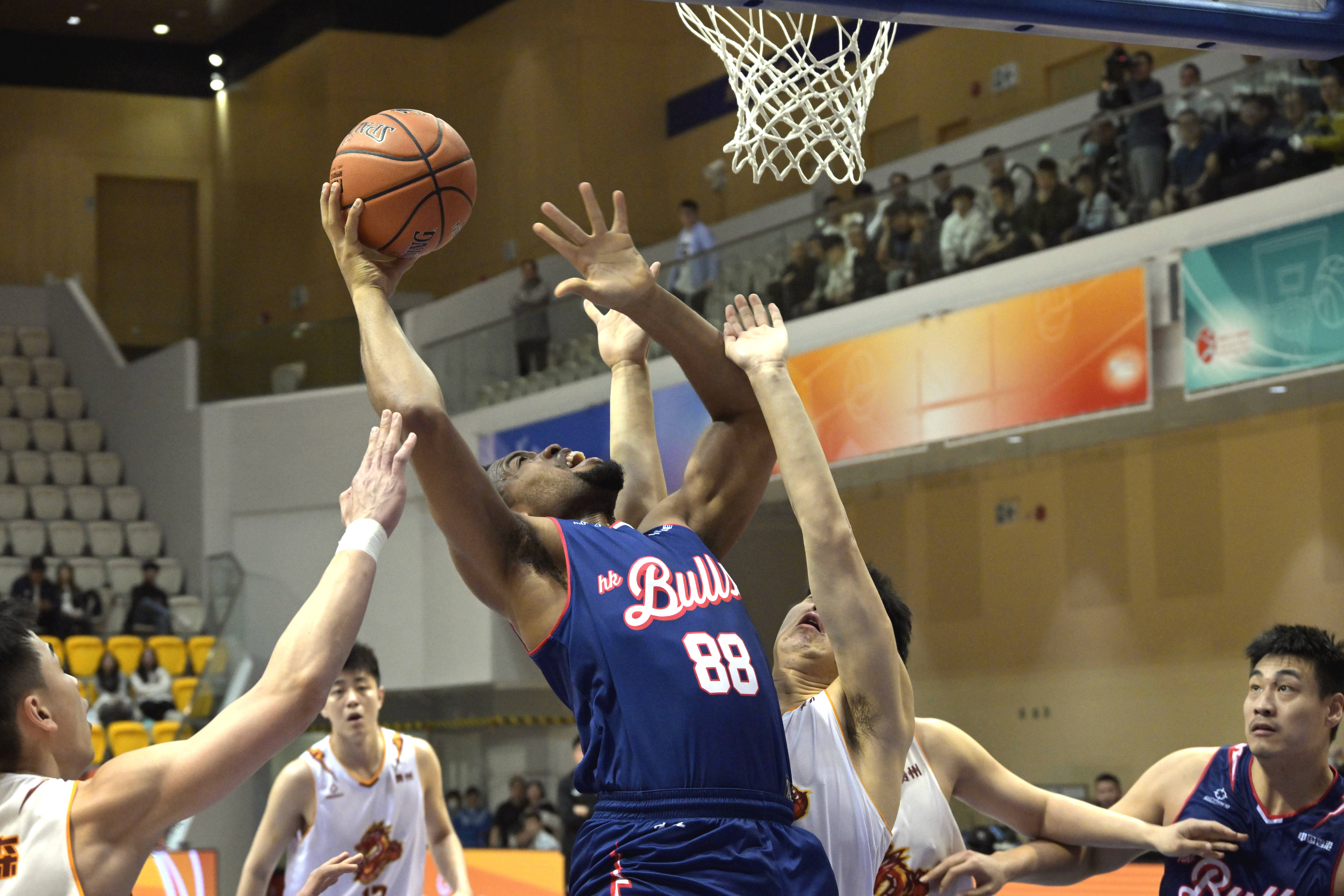 1月27日,香港金牛队球员刁展望(右二)在比赛中上篮。 新华社发(卢炳辉摄)