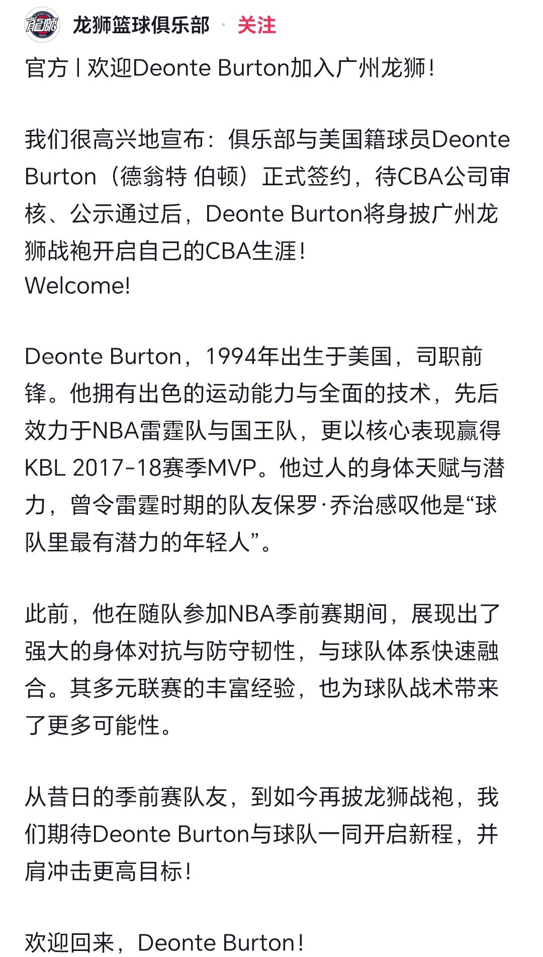 第二,俱乐部和美国球员伯顿签订合同,欢迎伯顿加盟广州龙狮!广州龙狮管理层和教练组看到伯顿的比赛录像视频,并果断进行试训后,伯顿的功能属性非常契合广州龙狮的气质,伯顿的打球风格有强度有韧性,加拿大主教练非常希望得到一个注重得分和方式的球员,不希望找到一个瞎进攻的外援,他融入球队文化非常的迅速,因此,伯顿的加盟有待联赛第二阶段进行最终验货大考验。